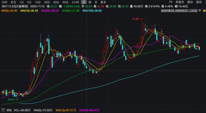 截至2月27日收盘,长盈精密报收38.69元,跌2.54%,公司市值526.53亿元。