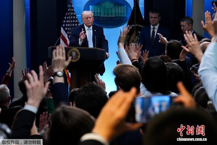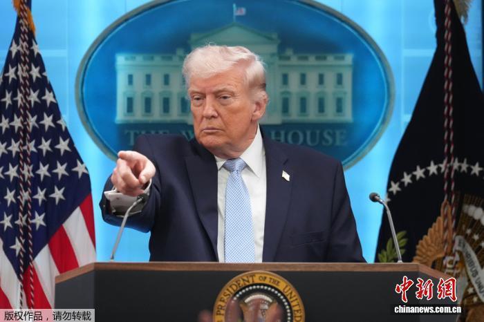 资料图:2026年4月6日,美国总统特朗普在美国国防部长赫格塞思和美军参谋长联席会议主席丹·凯恩的陪同下,于白宫接受记者采访。